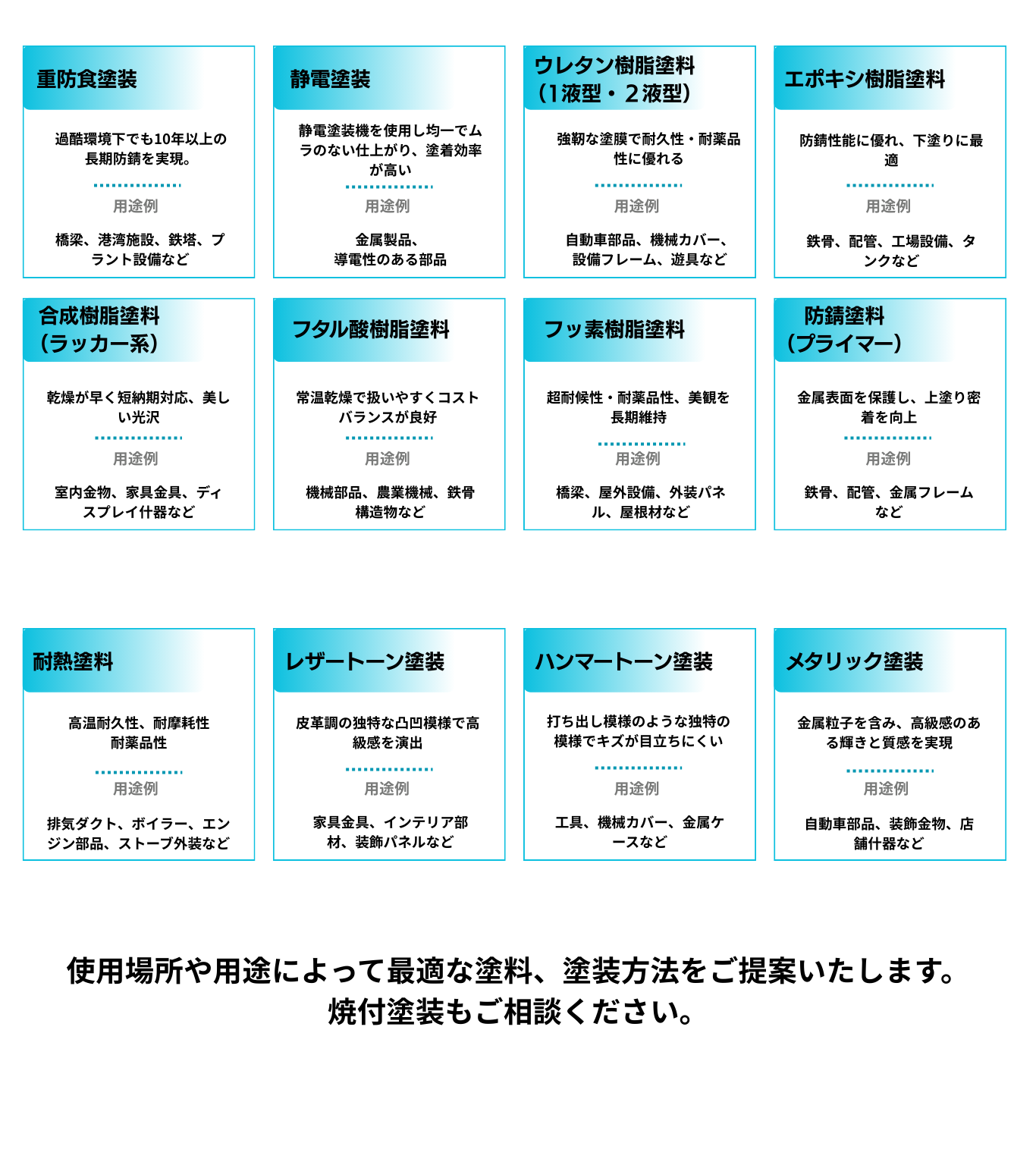 自然乾燥から焼付塗装まで塗装に関するご相談がございましたらお気軽にお問合せください。